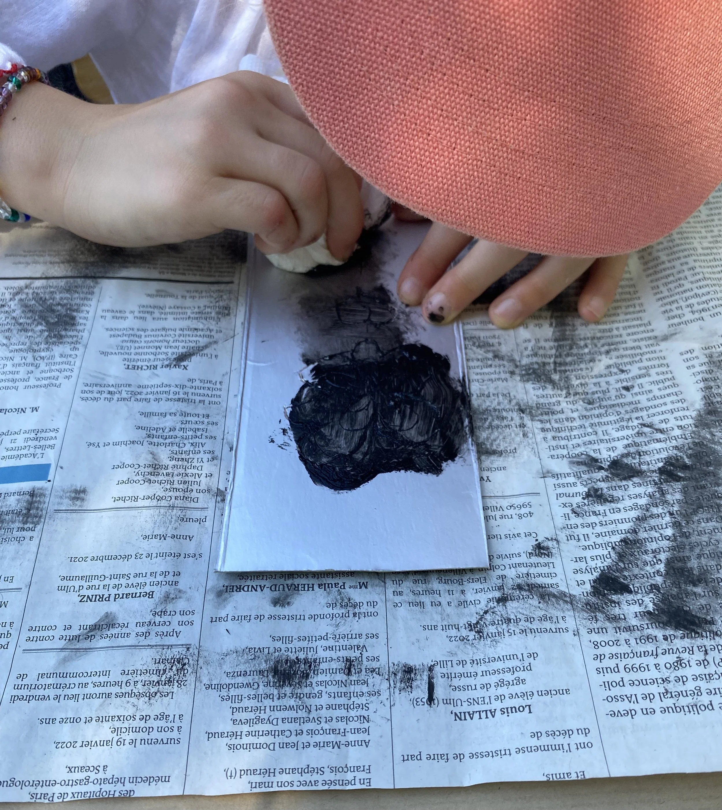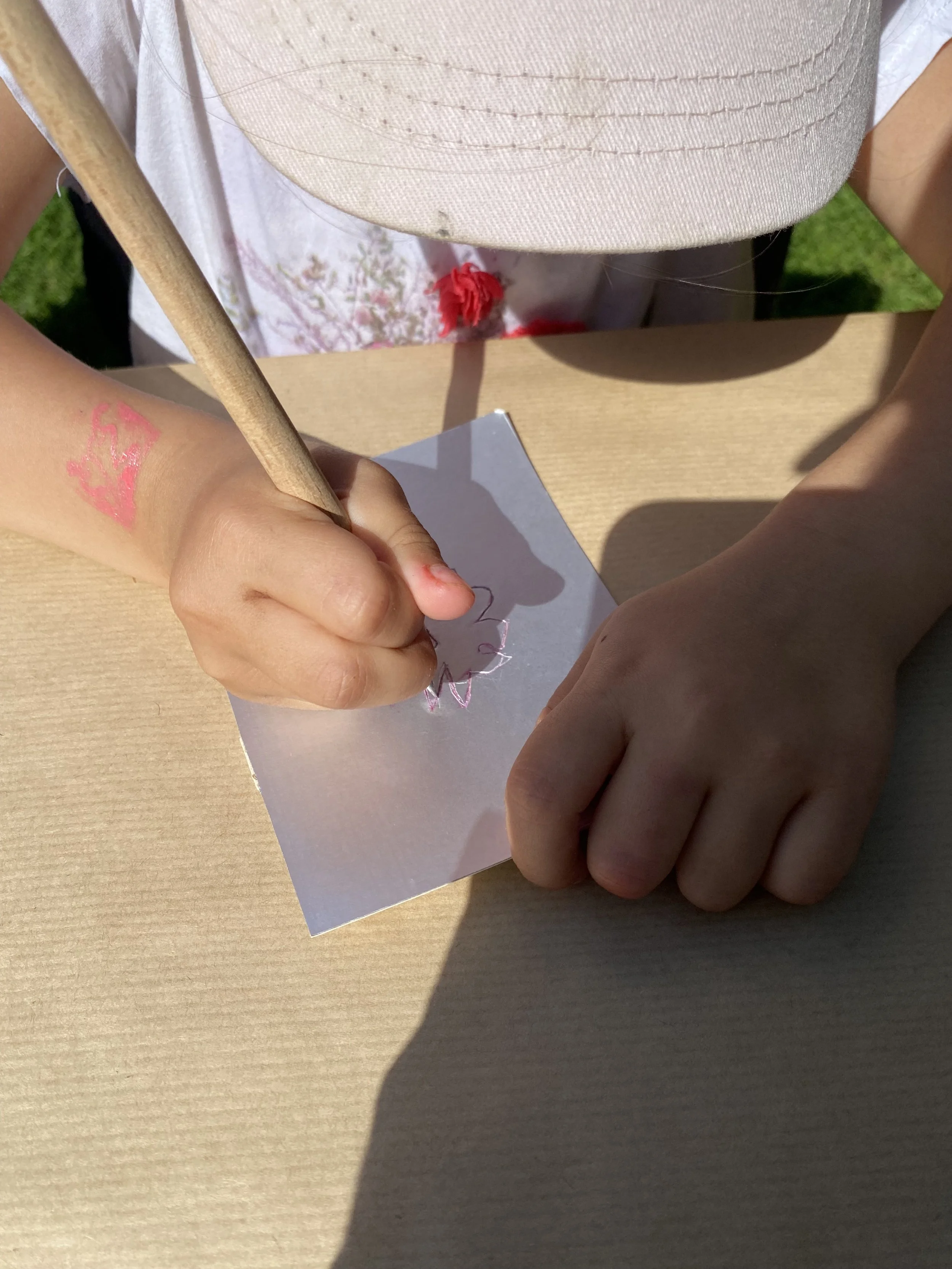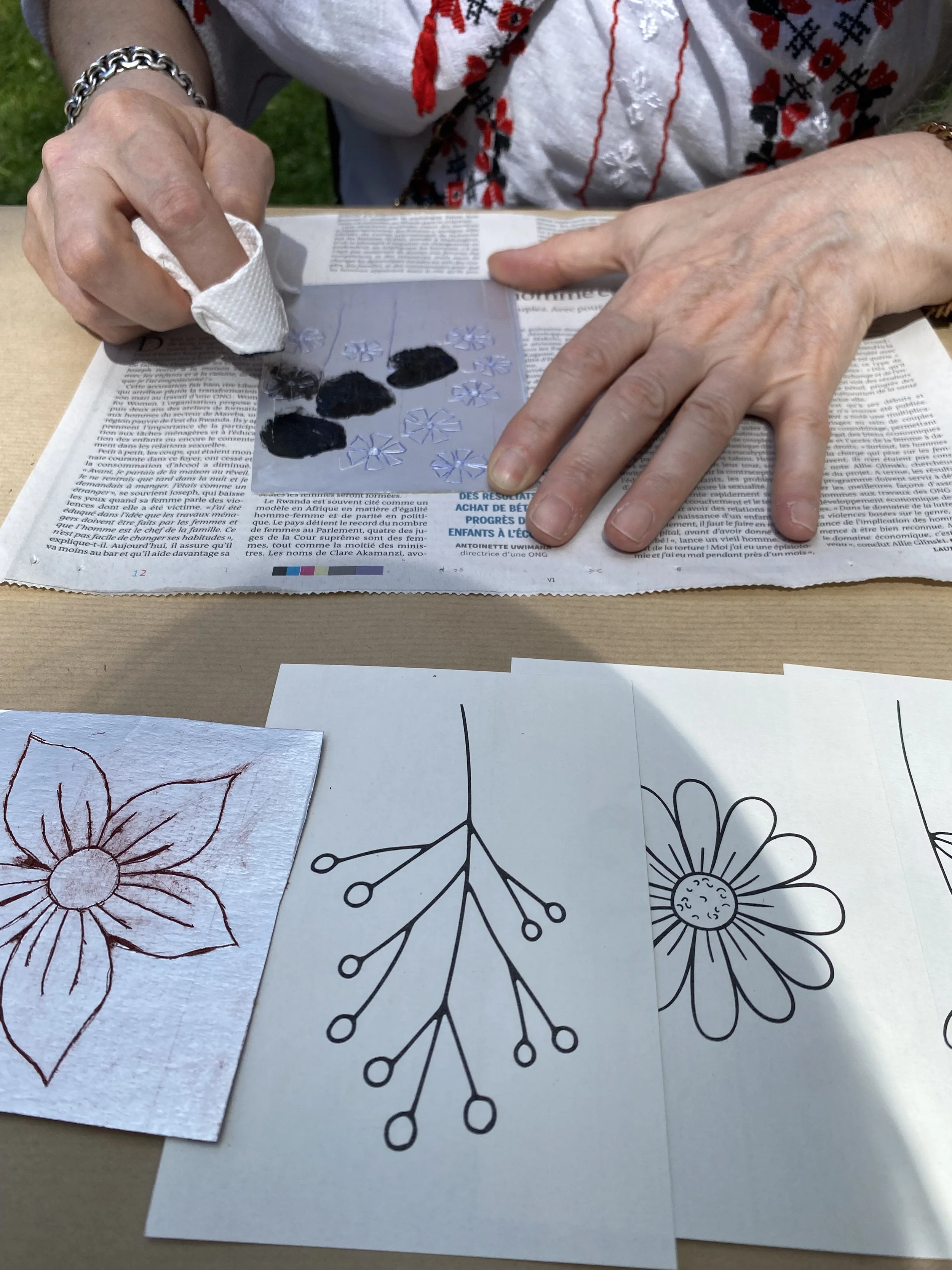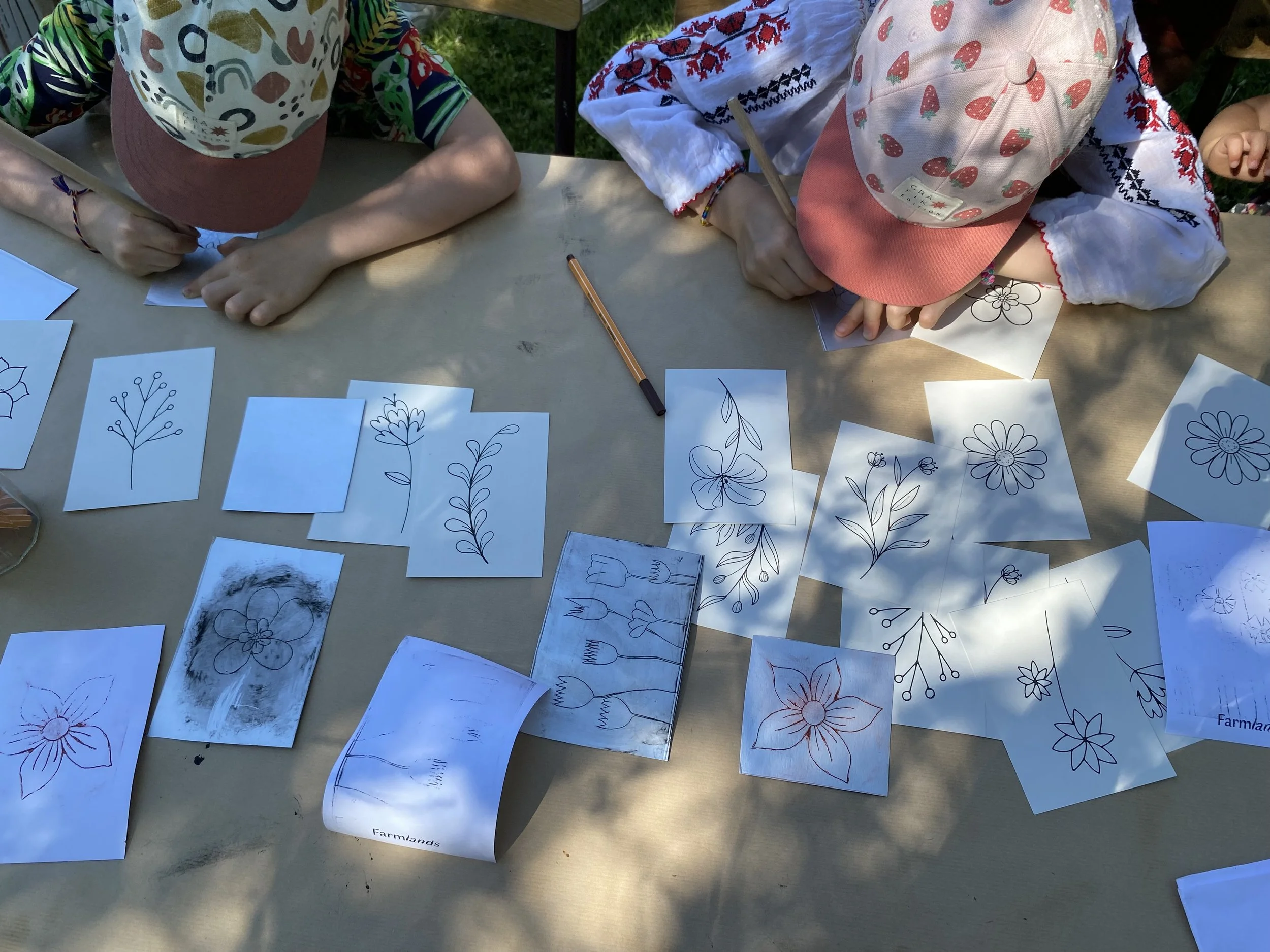 J’ai eu la chance de participer à la création d’un tout nouveau festival, Farmlands. À cette occasion, j’ai proposé un atelier de gravure sur Tetra Pak, ouvert aux enfants, aux adultes, ainsi qu’aux grands-parents. L’atelier s’articulait autour de l’univers floral, et chaque participant est reparti avec sa propre gravure, réalisée sur place.